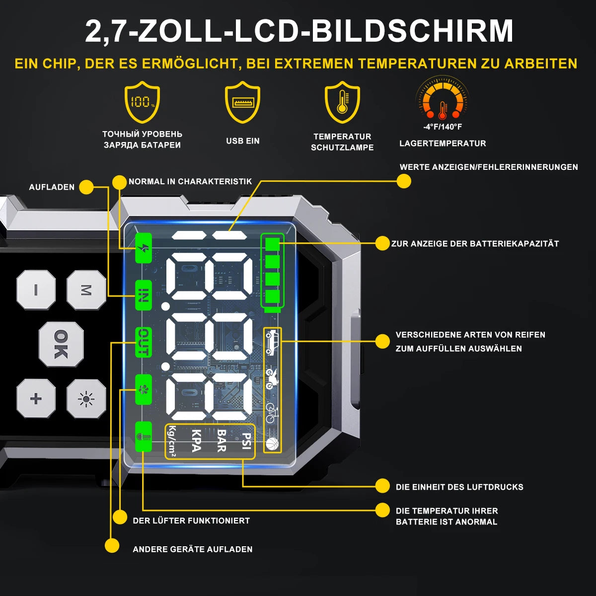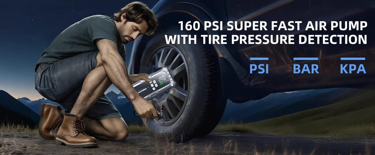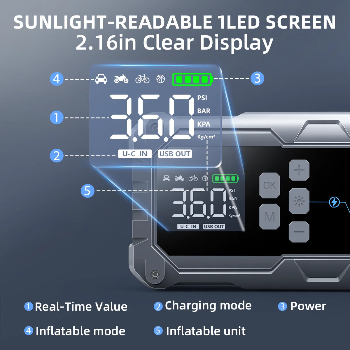 SMART DIGITAL TIRE INFLATION FUNCTION: The BSMOOM jump starter battery pack features an LED smart screen and advanced tire pressure detection, providing crucial information such as battery level, inflation mode, and real-time tire pressure. Supporting four units (PSI, BAR, KPA, KG/CM), the 150PSI air compressor efficiently inflates a normal car tire to 20PSI in about one minute, making it easy to use and highly convenient.