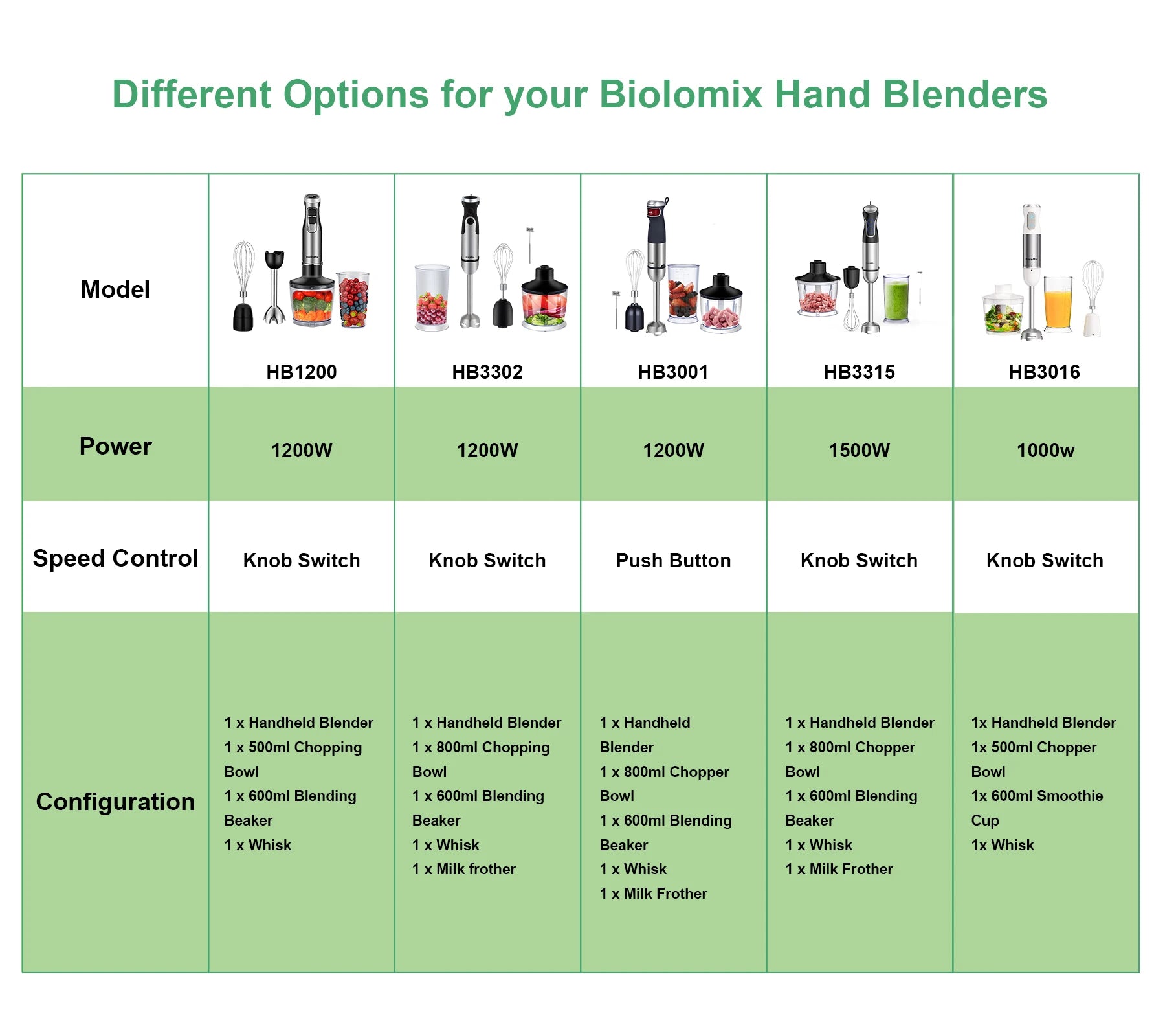 Power through smoothies, soups, and baby foods with the Biolomix 4-in-1 1200W immersion hand blender.