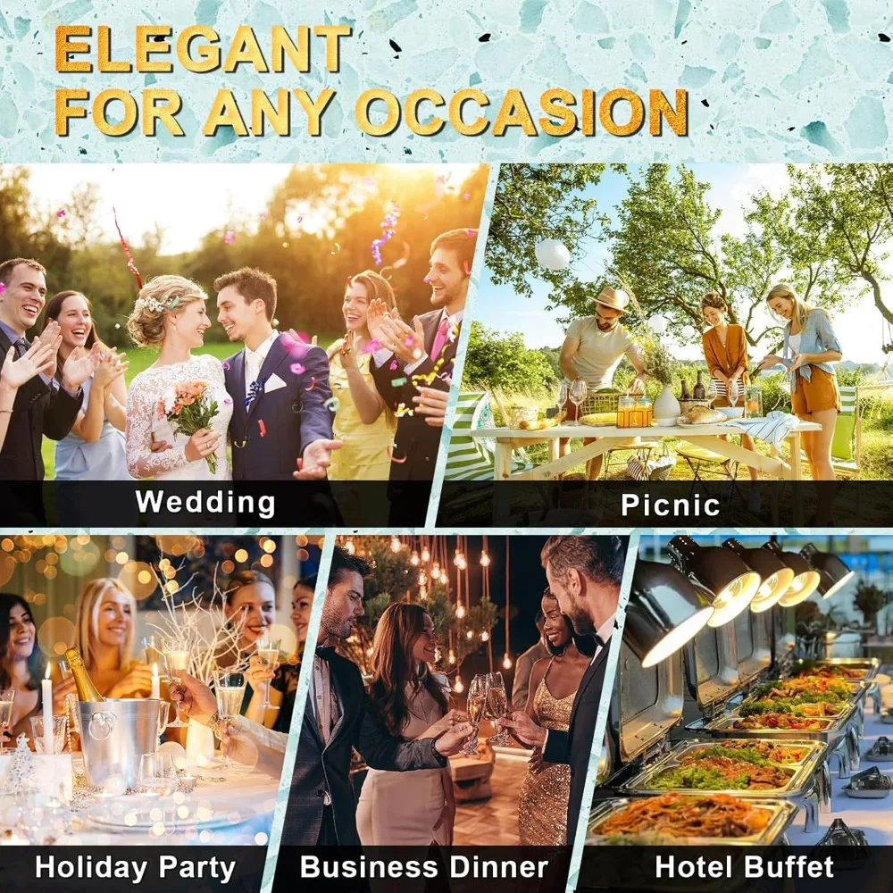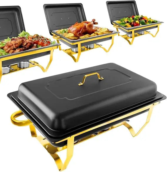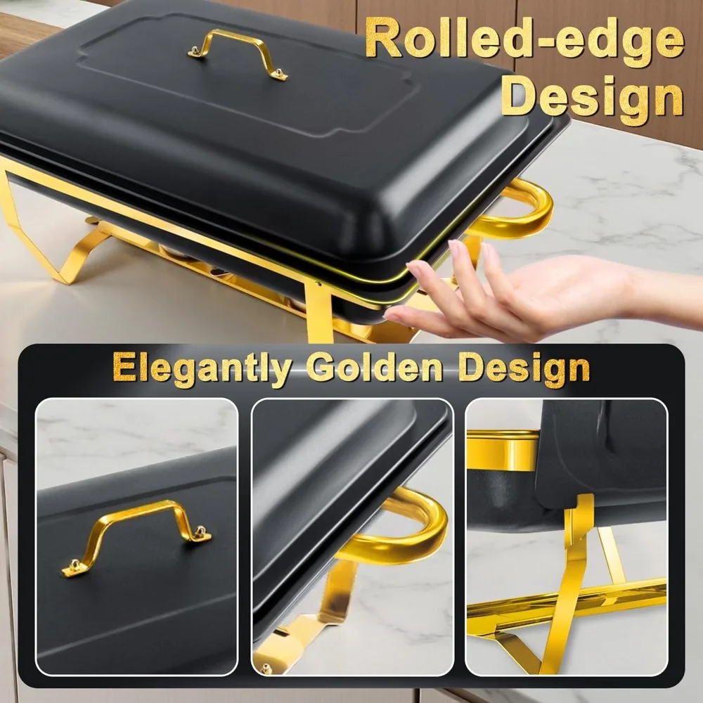 - Easy Setup & Storage: Folding gold frames offer quick assembly and compact storage. With wide handles for safe transport and smooth rolled edges to prevent accidental cuts, this black gold chafing dishes set is as practical as it is stylish.