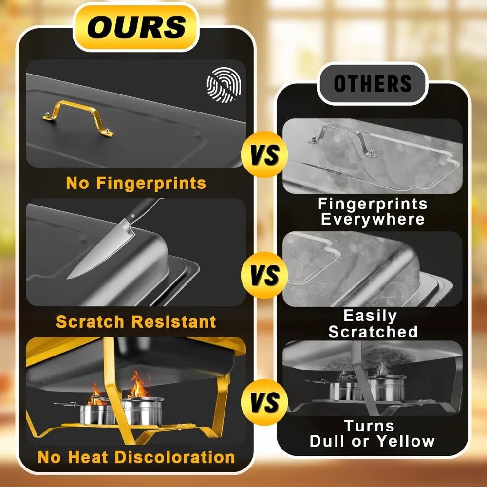 - Matte Black & Gold Elegance: Our chafing dishes for buffet lets you stand out from the crowd with a striking matte black finish and gold-tone accents. This unique design adds a modern luxury touch to any buffet servers, making your event feel upscale and unforgettable.