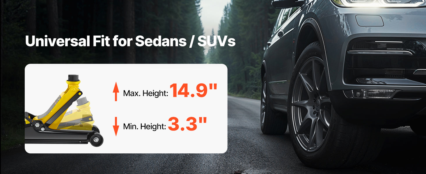 For All Your Lifting Needs: Min. Height: 3.35"/85 mm. Max. Height: 14.96"/380 mm. The wide lifting range meets your lifting needs of family cars, trucks, SUVs, etc. And a single piston hydraulic pump allows you to pump the jack to the desired height easily.