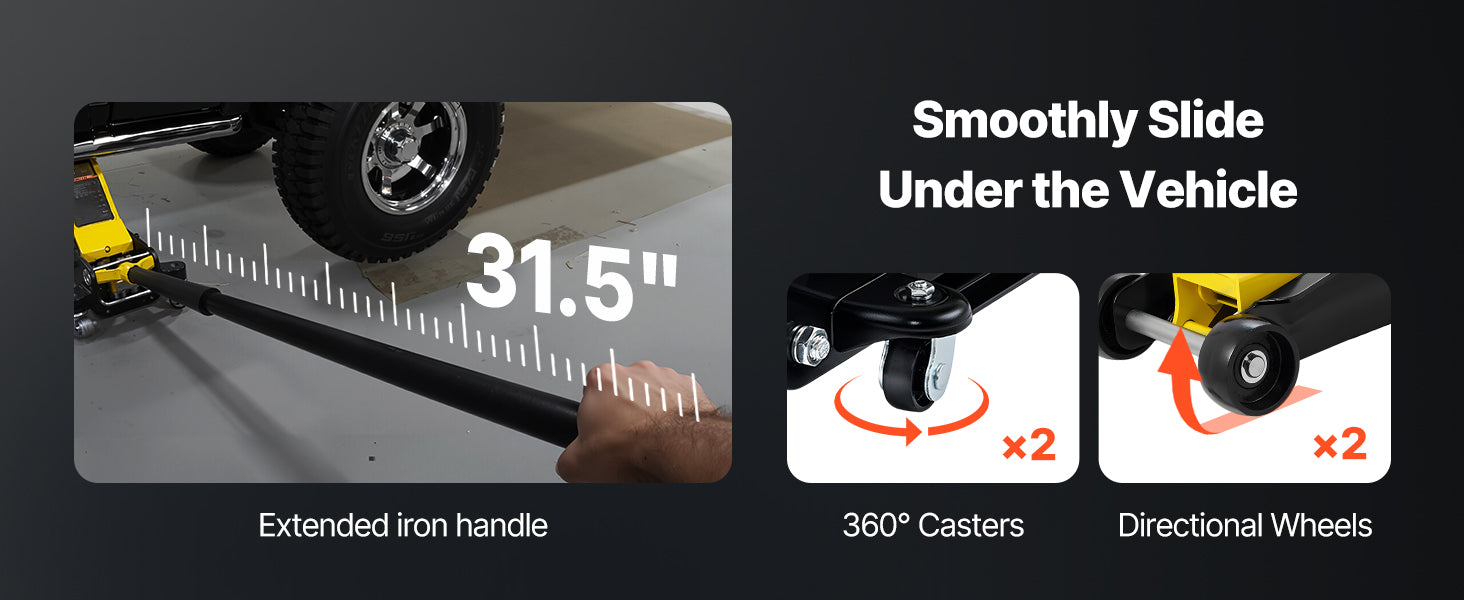 Rigid Steel Construction: Boasts heavy-strength steel construction, our low-profile jack is durable and sturdy to use. It is equipped with steel wheels (2 rear wheels are universal), making the jack easy to maneuver, steer, or roll. And the handle on the top is convenient for you to lift the jack.