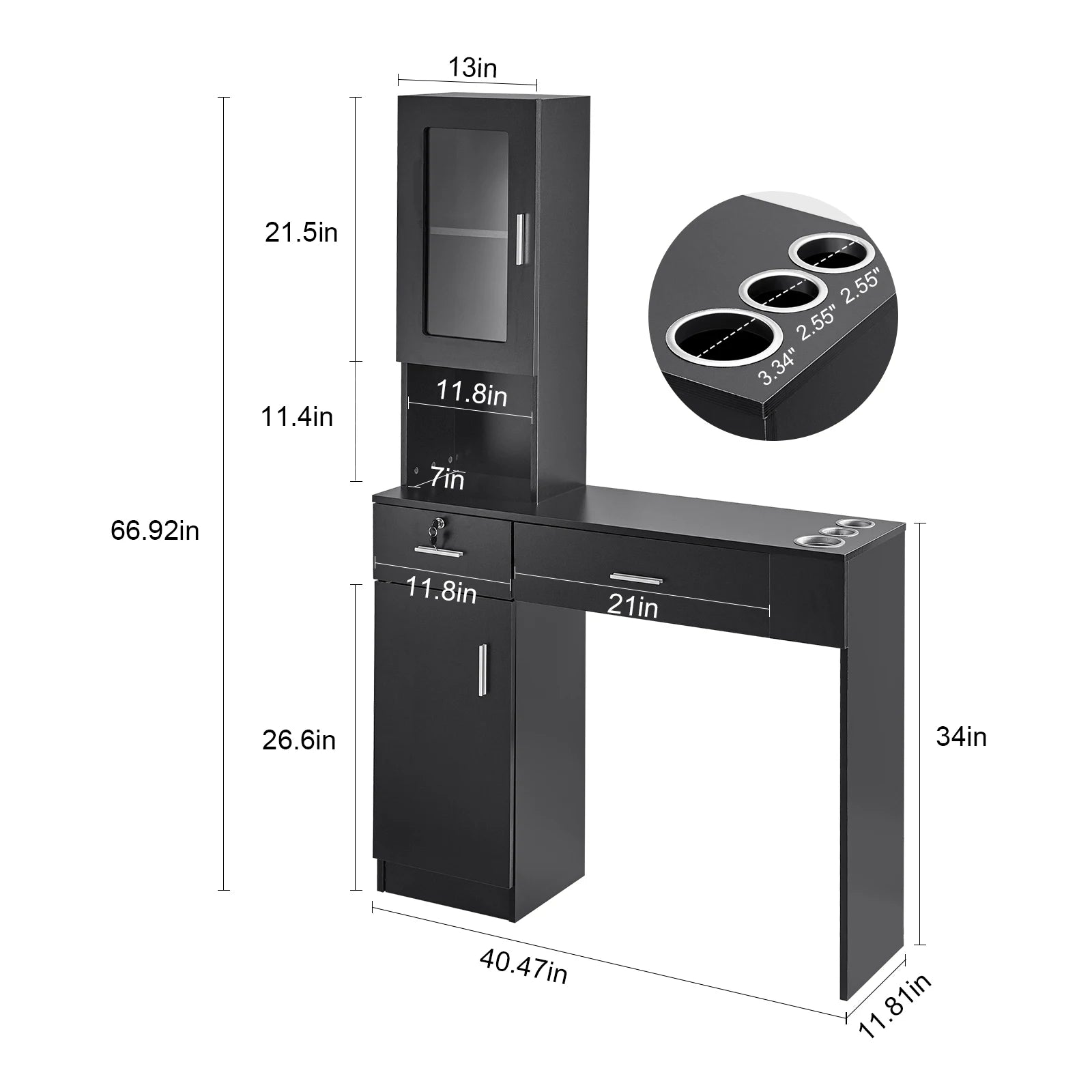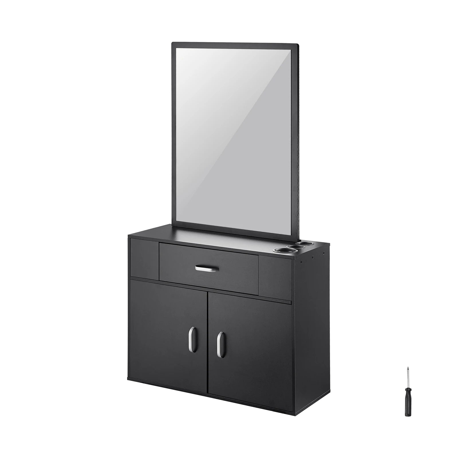 - High-definition mirror with a wide, durable tabletop lets you observe every detail while you style, and the integrated drawer plus double-door cabinet store tools, capes, and cleaning supplies out of sight.