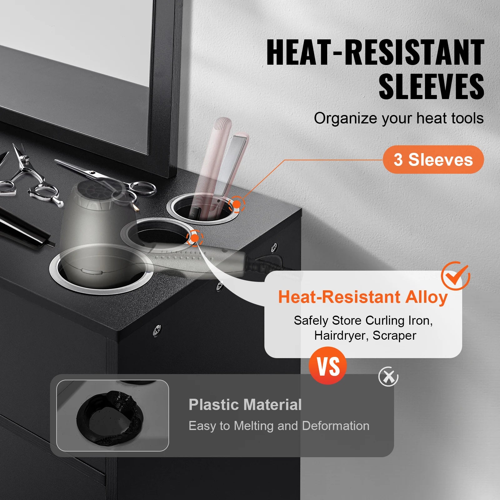 - Three heat-tool sleeves in heat-resistant alloy protect your curling irons, straighteners, and hot tools, with bottom covers to prevent tool drops and ensure workplace safety.